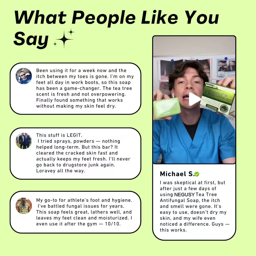 Most treatments only work on the surface while the fungus hides deeper in your skin and shoes. NEGUSY™ Tea Tree Athlete's Foot Defense Soap penetrates deep to kill fungus at the source while preventing reinfection — no more temporary relief that disappears in weeks, no more embarrassing relapses, and no more feeling like you'll never have normal feet again.